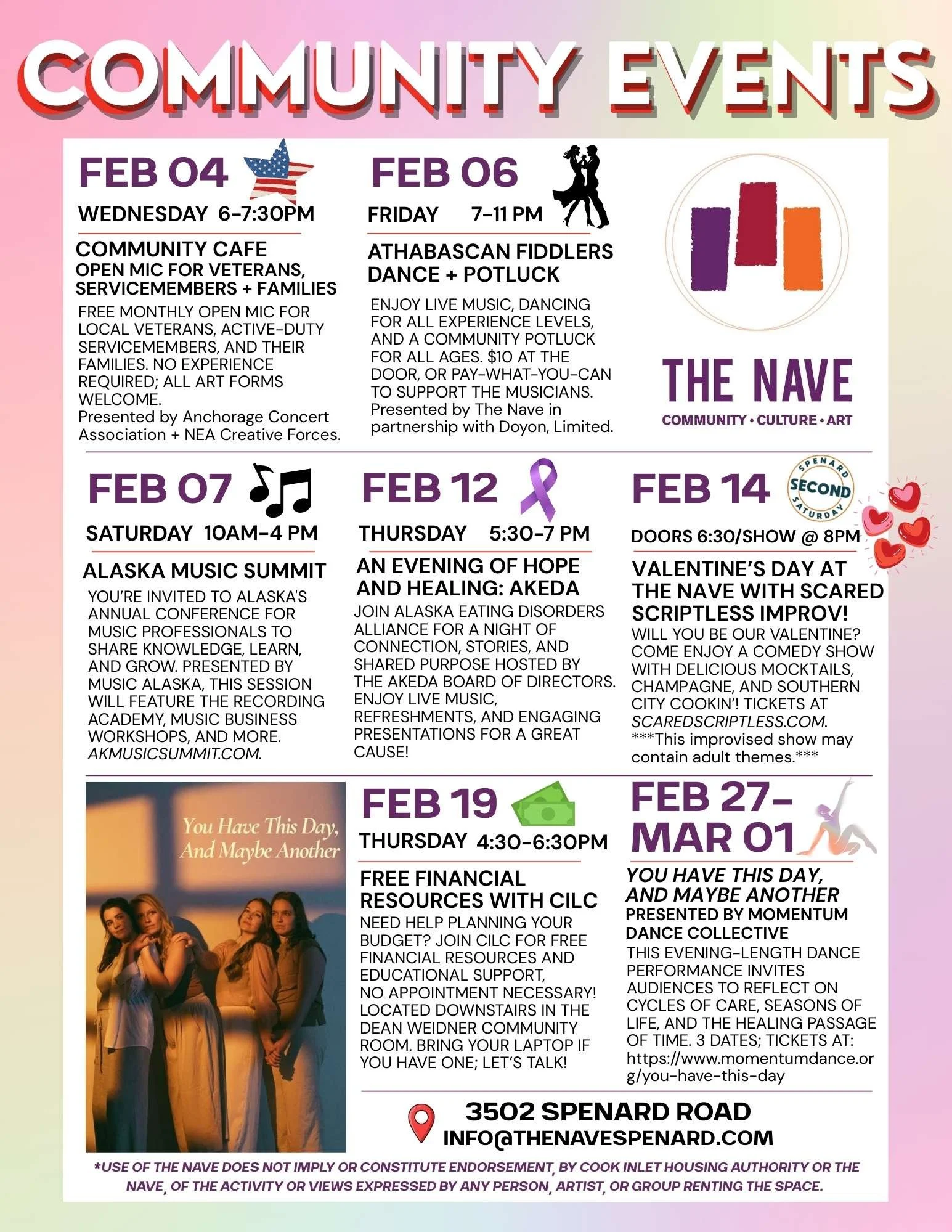 *Use of The Nave does not imply or constitute endorsement, by Cook Inlet Housing Authority or The Nave, of the activity or views expressed by any person, artist, or group renting the space.