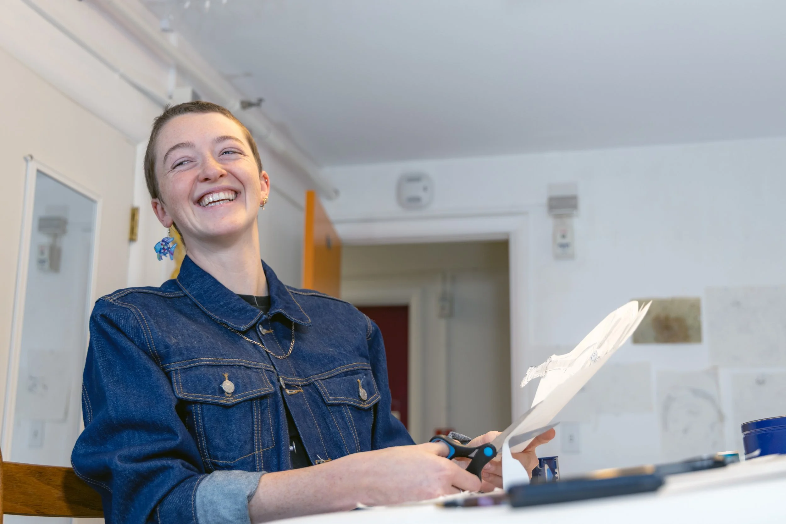 Cecilia Karoly-Lister joined The Nave Studio Artists in January 2025. A born-and-raised Alaskan interdisciplinary artist, her body of work spans quilting, guerrilla gardening, nature-based papermaking, oil painting, and mixed media installations. Her recent quilted pieces are constructed in paint-like layers, forming emotionally resonant scenes of queer love, daily life, and shared feasting.