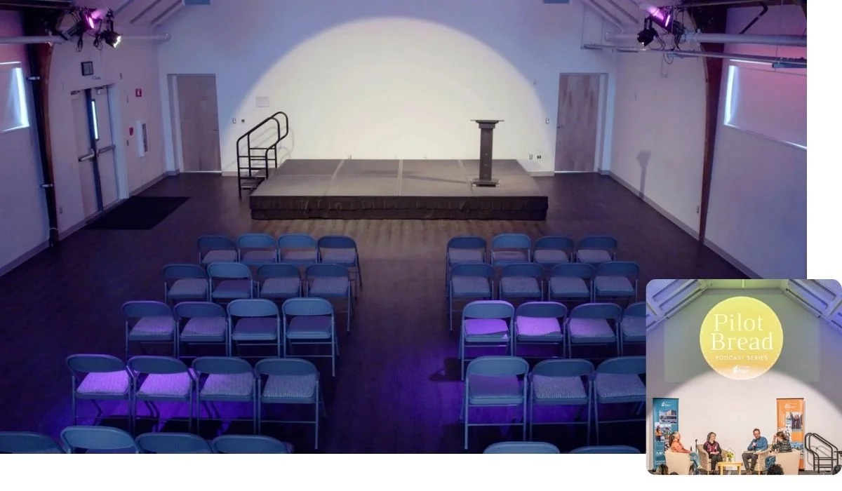 This downstairs classroom/multipurpose space is equipped with 20 comfortable chairs and 11 classroom tables, large mirroring monitors and a Polycom Studio video conferencing system ready for Teams and Zoom meetings. The sink, mini-fridge, and Bunn coffee machine make it a breeze to serve refreshments. Use of high-speed dedicated internet is included. Located just down the hall from The Nave restrooms, this space is ideal for classes, meetings, workshops, or trainings.