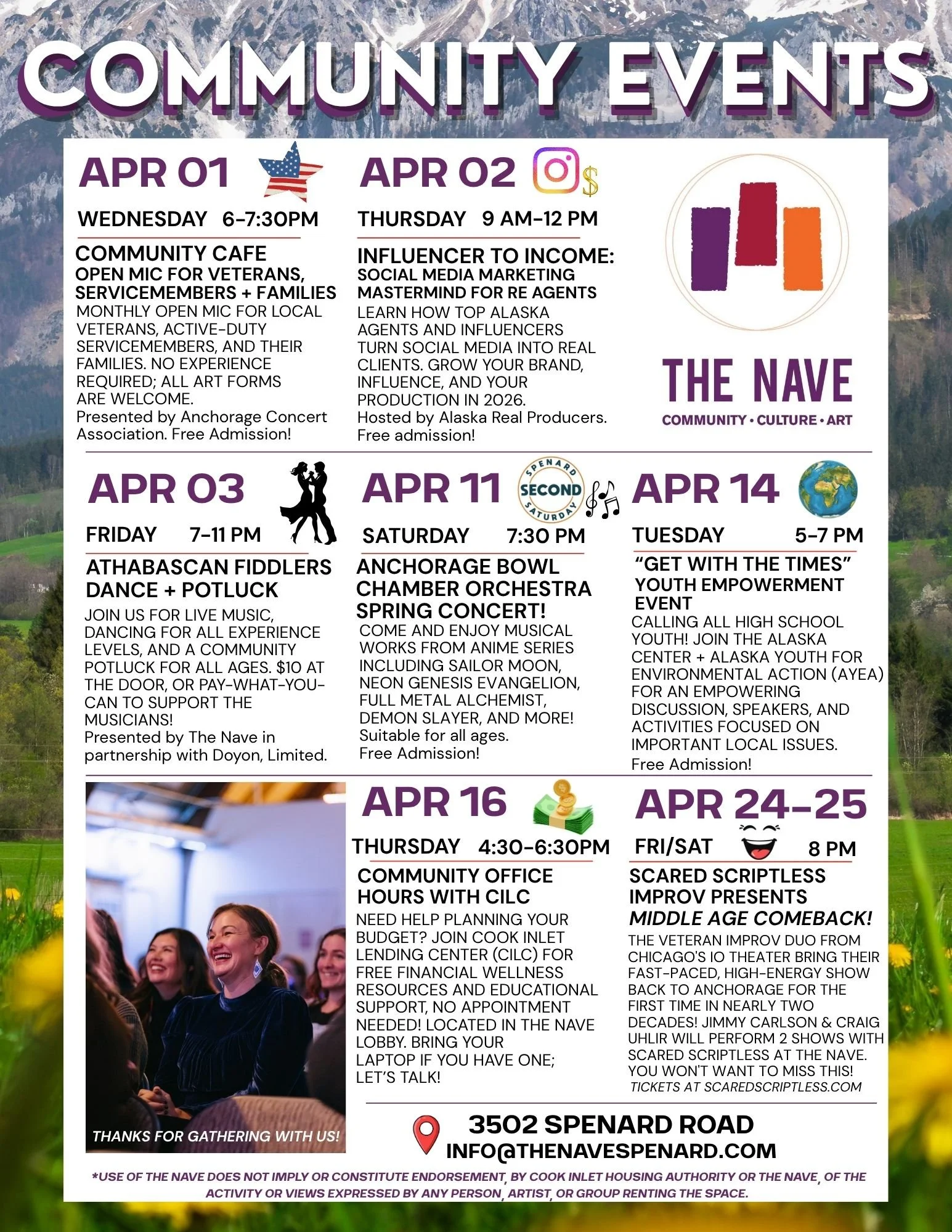 As a neighborhood hub for community, culture, and art, The Nave is host to a diverse array of local gatherings, performances, workshops, and more. Check out our Upcoming Events below for opportunities to connect, enjoy, and get involved in Spenard!